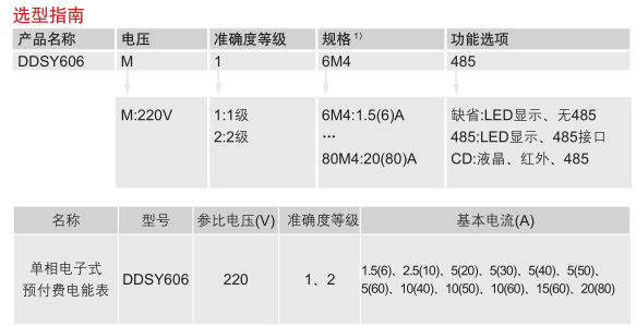 如客戶需要DDSY606型單相電子式預(yù)付費(fèi)電能表,電壓為220V,準(zhǔn)確度等級為1,電流規(guī)格為5(20)A,LED顯示,無485,則相對應(yīng)的訂貨編碼為DDSY606M120M4