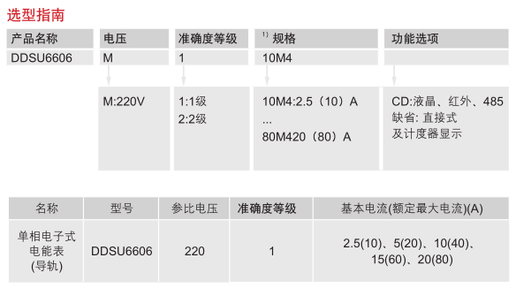 訂貨示例: 如客戶(hù)需要DDSU6606型單相電子式電能表(導(dǎo)軌、液晶、紅外、485),電壓為220V,準(zhǔn)確度等 級(jí)為1,電流規(guī)格為10(40)A,則相對(duì)應(yīng)的訂貨編碼為DDSU6606M140M4CD