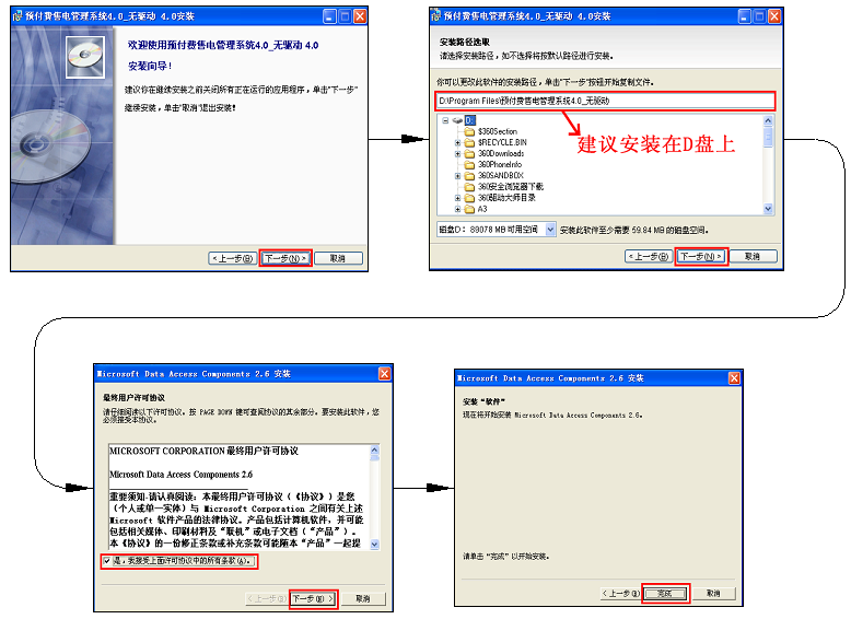 打開光盤中"預(yù)付費售電管理系統(tǒng)4.0_無驅(qū)動.exe",按以下步驟進(jìn)行安裝。