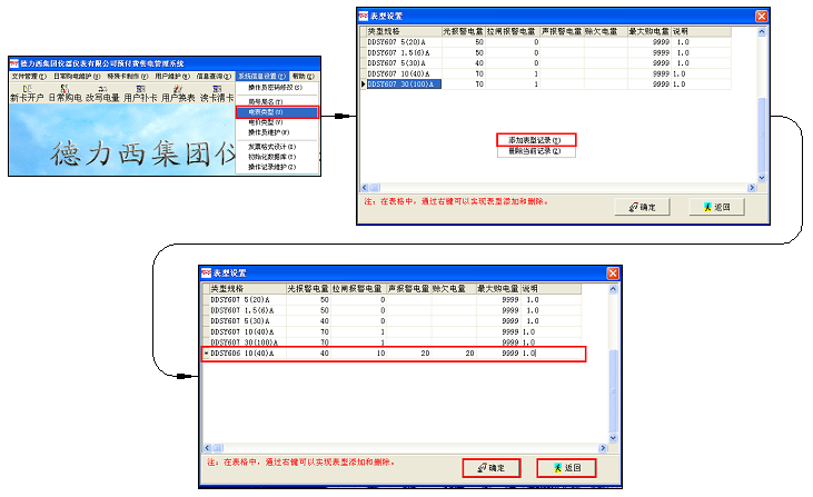 點擊下圖中"系統(tǒng)信息設(shè)置"->"電表類型",打開表型設(shè)置,點擊鼠標(biāo)右鍵,添加表型記錄,再逐一添加類型規(guī)格、報警電量、最大購電量等,再點確認(rèn)、返回。