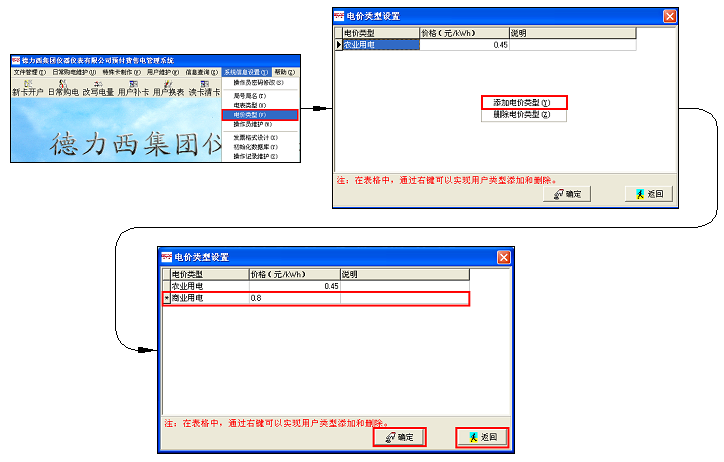 點擊下圖中"系統(tǒng)信息設(shè)置"->"電價類型",打開電價類型設(shè)置,點擊鼠標(biāo)右鍵,添加電價類型,再逐一添加電價類型、電價,再點確認(rèn)、返回。