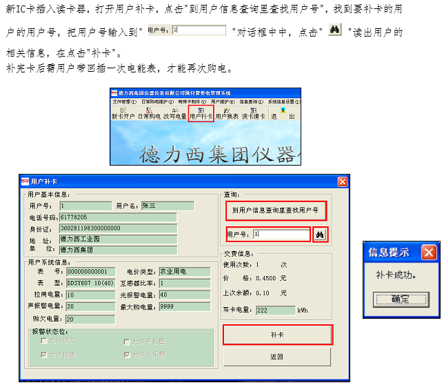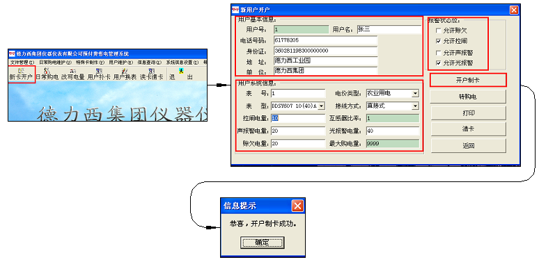 新IC卡插入讀卡器,打開新卡開戶,輸入用戶名、表號、選擇電價類型、表型、接線方式;再選擇報警方式;完成后點擊開戶制卡。