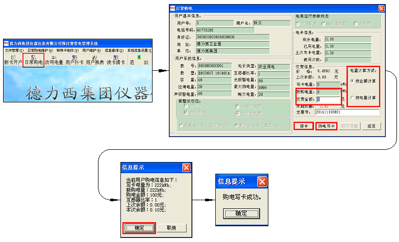 把用戶卡插入讀卡器,打開日常購電,先點擊讀卡,選擇計算方式,輸入購電量或金額;完成后點擊購電寫卡。