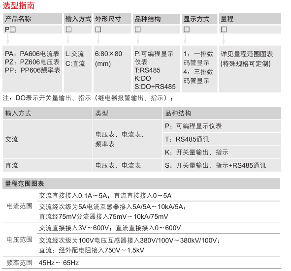 品種結(jié)構(gòu)為顯示儀表,顯示方式為一排數(shù)碼管顯示,量程為 AC500V 則相對(duì)應(yīng)的訂貨編碼為:
