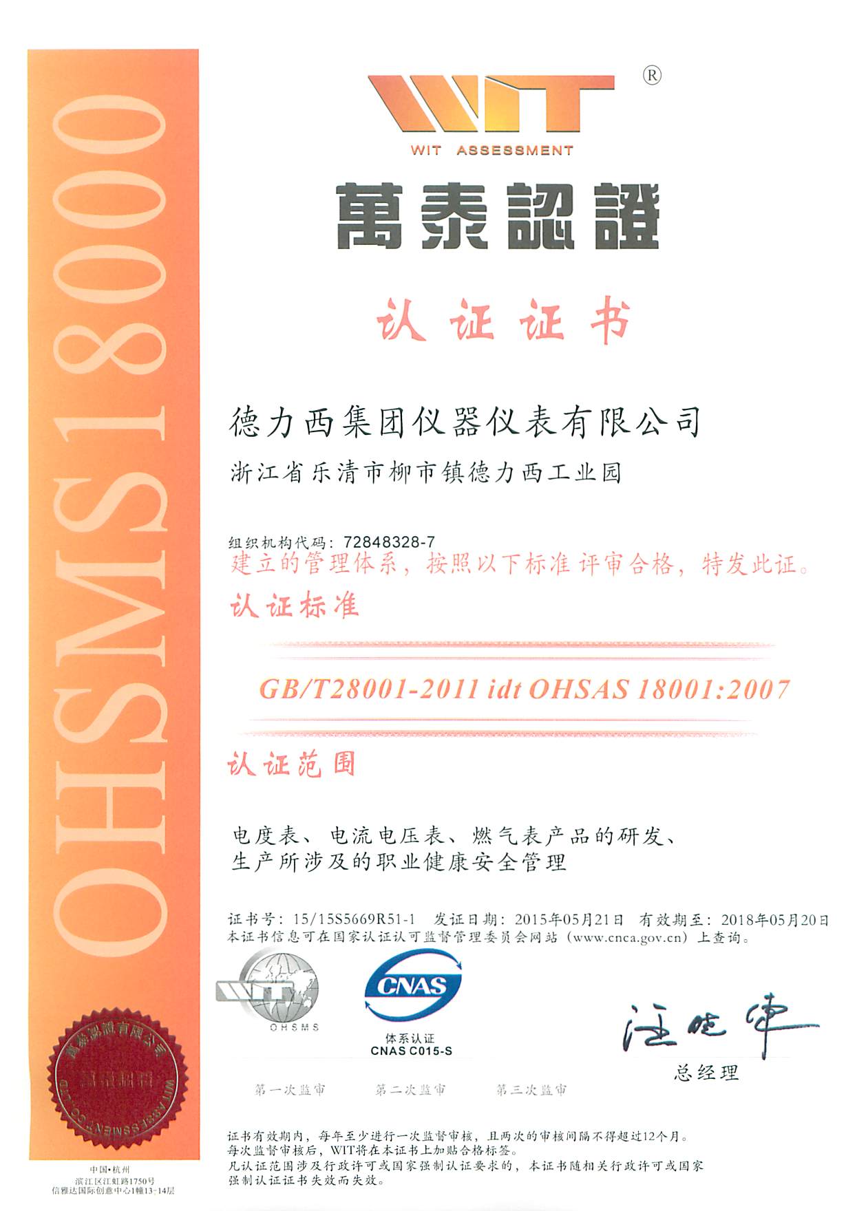 職業(yè)健康安全管理體系證書 中文