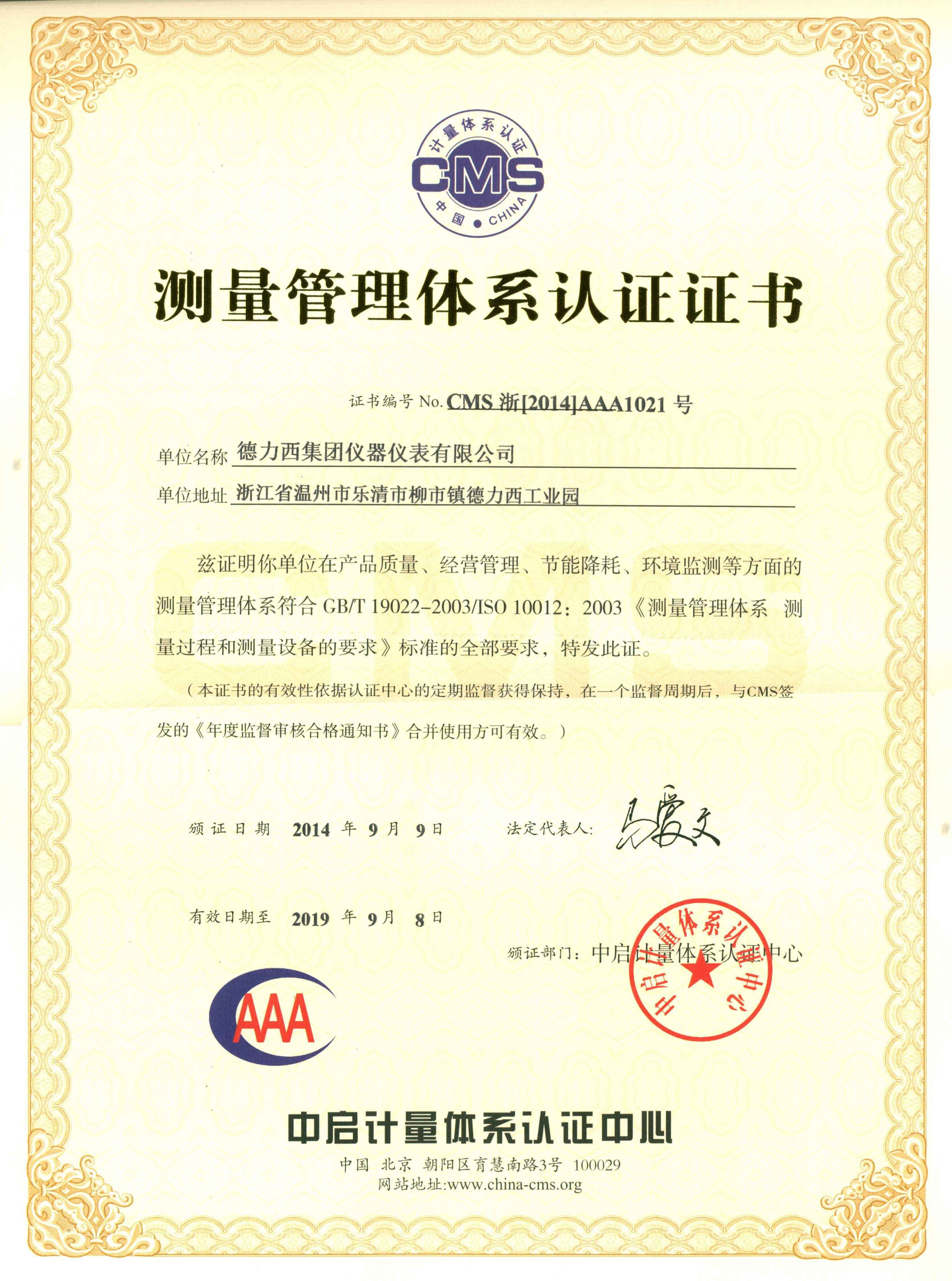 測量管理體系證書 中文